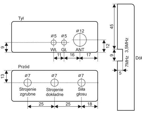 Na rysunku 4 są podane orientacyjne wymiary potrzebne podczas wykonywania otworów w obudowie KM35N. Warto najpierw wykonać otwory mniejsze (wiertłem o mniejszej średnicy), a potem skorygować wymiary iglakiem. Ta sama uwaga dotyczy przełącznika zakresów, którego otwory powinny być indywidualnie dopasowane w zależności od użytego modelu. Od sztywności konstrukcji i montażu zależy także stabilność VFO.