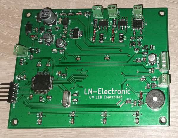 Tranzystory T6 oraz Q2 wraz z rezystorami R25, R26, R36, R12, R13, R44 służą do sterowania tranzystorem mosfet z kanałem typu N (NM1 – AOD4126) za pomocą sygnału PWM. Sygnał PWM służy do regulacji mocy lampy. Układ zapewnia wysterowanie tranzystora napięciem UGS >10 V w celu zapewnienia jak najmniejszej rezystancji RDSon oraz jak najskuteczniejszego wyeliminowania mocy strat związanej z przełączaniem tranzystora. Tranzystory T, T2, rezystory R8, R9, R10, R11 wraz z diodami D2, D4, D6, D8, tworzą dwa źródła prądowe, do których należy przyłączyć dwie gałęzie diod LED UV. Zmieniając wartości R8, R10, możemy zmienić prąd płynący przez te diody.