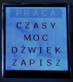 Po uruchomieniu urządzenia na wyświetlaczu pojawia się menu użytkownika, w którym do wyboru mamy takie opcje: PRACA, CZASY, MOC, DŹWIĘK, ZAPISZ (fotografia 5). Przyciskami UP, DOWN poruszamy się po menu, aby wejść do danej funkcji, naciskamy ENTER. Aby wyjść i powrócić do menu należy przytrzymać przez około 2 s przycisk ENTER, a następnie go zwolnić.