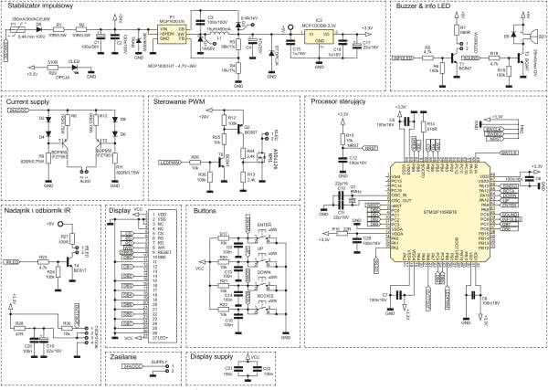 Dioda Zenera D7 została dodana jako dodatkowe zabezpieczenie układu przed pojawieniem się zbyt wysokiego napięcia. Z napięcia 5 V dostępnego na wyjściu przetwornicy jest wytwarzane napięcie 3,3 V za pomocą regulatora IC2, które zasila wyświetlacz oraz mikrokontroler. Układ typu MCP1703-3.3V jest regulatorem LDO z wbudowanym zabezpieczeniem przeciwko zwarciu. Do poprawnej pracy wymaga tylko kondensatorów filtrujących C16 oraz C17.