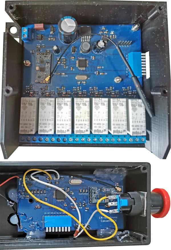 Za pomocą pinow A1...A4 od przełącznika dipswitch należy ustawić taki sam adres dla nadajnika oraz odbiornika (Uwaga adres musi być różny od zera). Po naciśnięciu przycisku na pilocie powinien się zmienić stan danego przekaźnika, który jest przypisany do tego przycisku. Jeśli wszystko działa prawidłowo można przystąpić do zamontowania odbiornika oraz nadajnika w obudowie. Zmontowane płytki nadajnika oraz odbiornika zostały pokazane na fotografii 1.