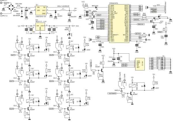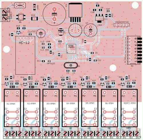 Karta przekaźników ma siedem wyjść. Każdy tor wyjściowy ma taką samą budowę, dlatego dalej opisana zostanie budowa tylko jednego toru. Przekaźnik R1 typu RM84 z cewką na 12 V jest sterowany za pomocą tranzystora T7. Rezystor R17 ogranicza prąd płynący na bazę tranzystora natomiast rezystor R18 uodparnia układ na zakłócenia. Dioda D2 zabezpiecza tranzystor T7 przed uszkodzeniem związanym z przełączaniem przekaźnika. Rezystor R23 wraz z diodą LED1 sygnalizuje o załączeniu przekaźnika.