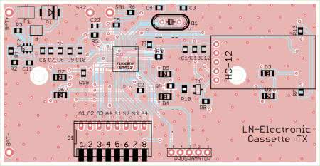 Przełącznik typu dipswitch S1 służy do zmiany ustawień tzn. ustawienia adresu oraz kanału nadawania. Ustawienia tego przełącznika muszą być zgodne z ustawieniami przełącznika odbiornika – CassetteRX. Kondensatory C12, C13, C14 filtrują zasilanie do transceivera HC-12, natomiast poprzez tranzystor T1 mikrokontroler steruje czy do modułu są wprowadzane nowe ustawienia czy po prostu znajduje się on w trybie nadawania oraz odbierania danych.