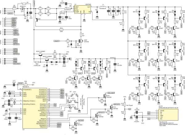 Sterownik z założenia miał pracować w samochodzie, dlatego starałem się, aby wszystkie użyte do jego budowy elementy były kwalifikowane pod AEC. Jako mikrokontroler sterujący został wybrany ATmega48, który jest taktowany za pomocą zewnętrznego rezonatora kwarcowego o częstotliwości 8 MHz. Rezystor R55 oraz kondensator C17 zapewniają właściwe zerowanie sprzętowe. Złącze PROG służy do podłączenia programatora ISP. Do złącza HC-05 należy przylutować moduł Bluetooth, który ma zgodne wyprowadzenia oraz jest umieszczony na fabrycznej podstawce PCB wyposażonej w złącze goldpin. Kontrolerem można też sterować za pomocą przycisków microswitch UP, DWN, SEL.