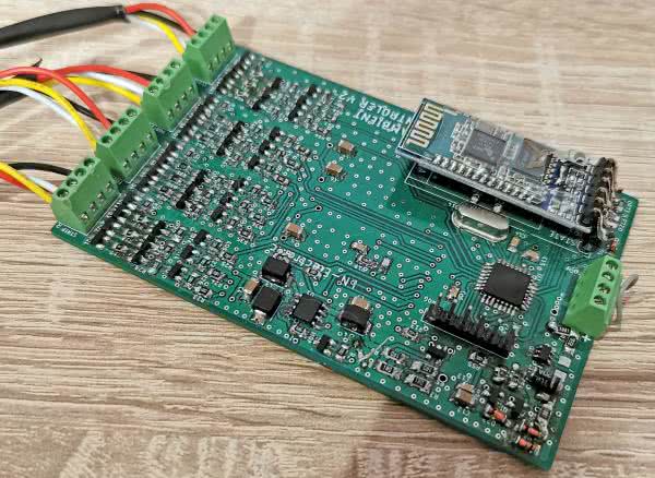 Jeśli zamierzamy zasilać kontroler napięciem 5 V, wtedy należy sprawdzić, czy na podstawce modułu HC-05 nie ma diody prostowniczej na wejściu zasilania, która zabezpiecza moduł przed odwrotnym podłączeniem napięcia. Dioda ta powoduje, że moduł musi być zasilany napięciem nieco wyższym niż 5 V. Dlatego, aby mógł on działać przy zasilaniu 5 V, należy tę diodę wylutować, a pady zewrzeć. Zmontowana płytka od strony TOP została pokazana na fotografii 1.