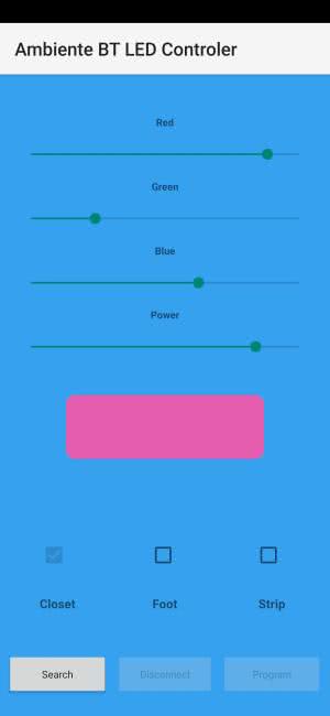 Za pomocą trzech suwaków, zmieniamy moc danego koloru. Zmieniając wartości za pomocą wszystkich trzech suwaków jesteśmy w stanie uzyskać dowolny kolor. Podgląd ustawionego koloru oraz moc diod LED jest możliwy za pomocą prostokąta, znajdującego się pod suwakami. Nad przyciskami możemy zaznaczyć wyjście, którego parametry chcemy zmienić. Mając zaznaczone wyjście CLOSET zmieniamy wyjście CLOSET na sterowniku. Mając zaznaczone wyjście STRIP, zmieniamy wyjście STRIP na sterowniku, natomiast gdy mamy zaznaczone wyjście FOOT, wtedy zmieniamy wyjście FOOT1 oraz FOOT2 na sterowniku.