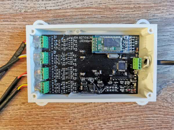 Po zmontowaniu płytki, do złącza PROG należy podłączyć programator i zaprogramować mikrokontroler. Następnie do wyjścia kontrolera należy podłączyć diody LED RGB. Kolejny krokiem jest zainstalowanie aplikacji Ambiente BT LED Controler na urządzeniu z systemem Android np. na smartfonie. Należy pamiętać o załączeniu Bluetooth, lokalizacji i zezwoleniu aplikacji na dostęp do tych modułów. Po tych czynnościach należy podłączyć zasilanie do sterownika, a następnie wyszukać i połączyć się z modułem HC-05 poprzez jego wyszukanie w aplikacji za pomocą przycisku SEARCH. Po tym wszystkim należy sprawdzić, czy wszystkimi kanałami wyjściowymi da się poprawnie sterować.