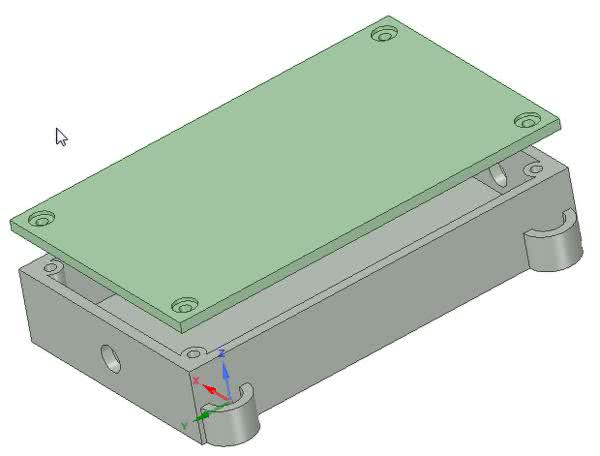 Obudowa sterownika składa się z dwóch części, które zostały wykonane na drukarce 3D. Płytka PCBA została przymocowana do obudowy klejem na gorąco. Pokrywka oraz główna część została przymocowana za pomocą śrubek 3 mm. Model obudowy został pokazany na rysunku 4. Na fotografii 4 znajduje się zamontowana płytka w obudowie.