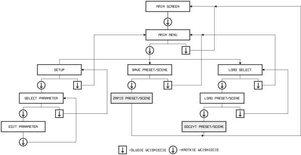 W trybie menu SAVE_PRESET/SCENE i LOAD_PRESET/SCENE pokazywane są dostępne numery banków pamięci urządzenia (wszystkich ustawień urządzenia) przeznaczone do operacji zapisu lub odczytu (13 banków danych). Należy jednak wspomnieć o dość istotnej funkcjonalności dotyczącej wykonywanych operacji. W trybie zapisu oprócz ustawień urządzenia zapisywane są również bieżące ustawienia wszystkich potencjometrów regulacyjnych. W trybie odczytu możliwe jest przywołanie samych ustawień urządzenia (tzw. preset) lub też ustawień urządzenia wzbogaconych o zapamiętane pozycje potencjometrów (tzw. sceny). Co ważne, w trakcie odczytu tychże ustawień potencjometrów są one równocześnie wysyłane poprzez interfejs MIDI urządzenia.