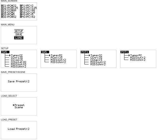 Dla potencjometrów pokazywane są (od lewej do prawej): numer wyjścia MIDI, które obsługuje wybrany potencjometr (1/2), numer potencjometru (1…6), rodzaj kontrolera MIDI obsługiwanego przez wyświetlany element (CC lub PC) oraz wartość tego kontrolera MIDI (ustawienie potencjometru). W trybie menu MAIN_MENU pokazywane są dostępne opcje menu urządzenia: SETUP, SAVE i LOAD. W trybie SETUP, czyli w trybie ustawień elementów regulacyjnych (potencjometrów lub foot-switchy) pokazywane są nastawy wybranego elementu regulacyjnego. Co oczywiste, nastawy te zależne są od rodzaju elementu regulacyjnego (potencjometr lub foot-switch) oraz jego typu (CC lub PC). Dla foot-switcha typu CC dostępne są następujące nastawy: