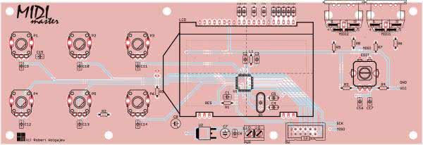 Schemat montażowy urządzenia midiMaster pokazano na rysunku 4. Jak widać, zaprojektowano bardzo zwarty obwód drukowany przeznaczony w zdecydowanej większości do montażu przewlekanego. Montaż urządzenia rozpoczynamy od wlutowania mikrokontrolera, jako że jest to jeden z niewielu elementów przeznaczonych do montażu SMD. Dalej montujemy stabilizator, następnie rezonator kwarcowy, pozostałe elementy bierne a na końcu elementy mechaniczne w rodzaju potencjometrów, enkodera czy gniazd połączeniowych (PWR, SW, MIDI1 i MIDI2).