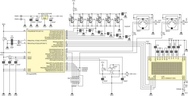 - LCD: wyświetlacz graficzny LCD-AG-C128064CF-DIW