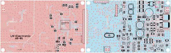 Wszystkie elementy odpowiedzialne za zasilanie mikrokontrolera, sensora, wyświetlacza zostały umieszczone na stronie TOP natomiast pozostałe elementy umieszczono na stronie BOTTOM. Dodatkowo na stronie TOP znajduje się obszar niepokryty soldermaską. Do tego obszaru można przykleić niewielki aluminiowy radiator za pomocą kleju termoprzewodzącego.