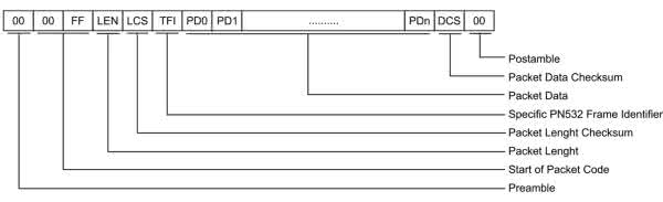 - TFI: to identyfikator typu ramki danych: 0xD4 oznacza ramkę wysyłaną z hosta do modułu PN532, zaś 0xD5 oznacza ramkę wysyłaną z modułu PN532 do hosta,