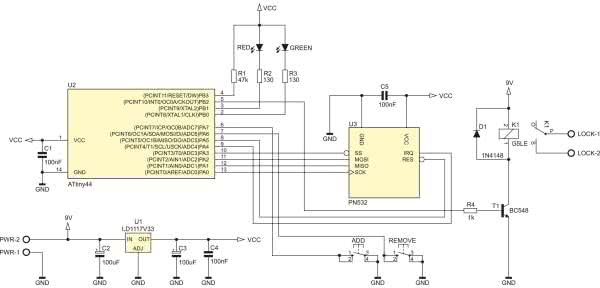 Schemat urządzenia pokazano na rysunku 3. Jak widać, zaprojektowano bardzo prosty system mikroprocesorowy, którego sercem jest niewielki mikrokontroler firmy Microchip (dawniej Atmel) o oznaczeniu ATtiny44 taktowany wewnętrznym, wysokostabilnym generatorem RC o częstotliwości 1 MHz. Mikrokontroler ten odpowiedzialny jest za programową obsługę interfejsu SPI (w ramach współpracy z modułem PN532), obsługę interfejsu użytkownika w postaci dwóch diod LED (GREEN i RED) oraz dwóch przycisków funkcyjnych (ADD i REMOVE) oraz sterowanie pracą wbudowanego przekaźnika K1. Zadań nie jest zbyt wiele, w związku z czym wbudowana pamięć Flash o wielkości 4 kB spokojnie wystarcza do realizacji zamierzonych funkcjonalności (w zasadzie wykorzystana jest niespełna w połowie). Przejdźmy zatem do opisu sposobu działania urządzenia NFC Lock.