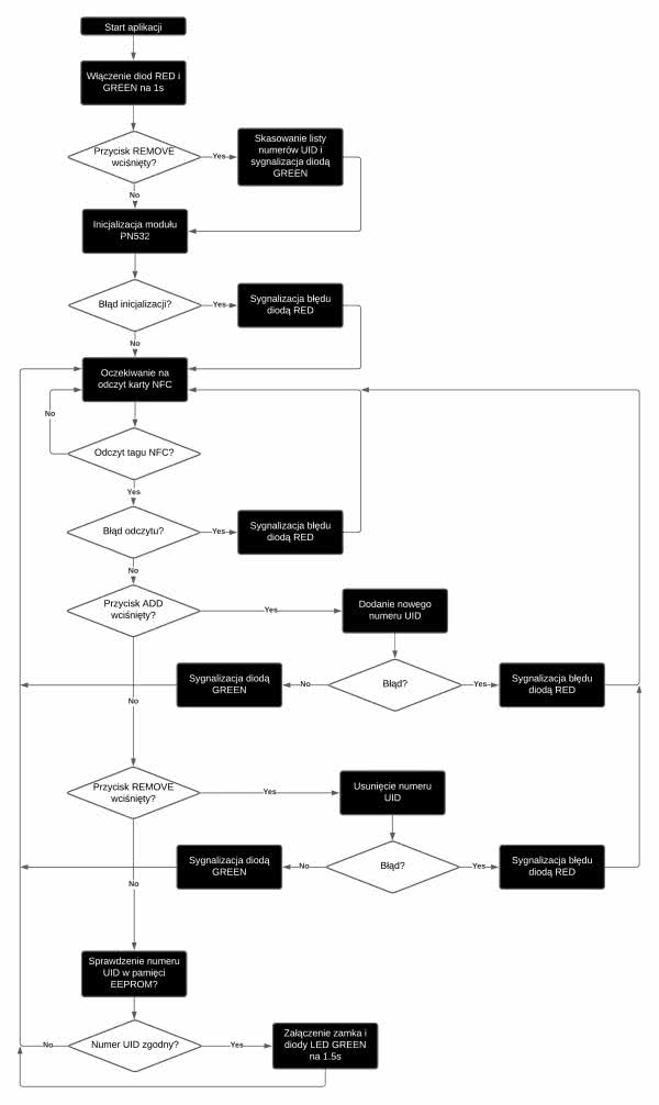 Przebrnęliśmy przez część aplikacyjną. Warto zauważyć, że większość funkcji zwraca wartość informującą o potencjalnych błędach. Pora na omówienie sprzętowej części naszego urządzenia NFC Lock.