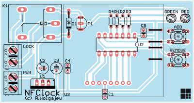 Schemat montażowy urządzenia NFC Lock pokazano na rysunku 5. Jak widać, zaprojektowano bardzo prosty, jednostronny obwód drukowany z zastosowaniem wyłącznie elementów THT. Montaż urządzenia rozpoczynamy od przylutowania mikrokontrolera oraz pozostałych elementów półprzewodnikowych (z wyłączeniem modułu PN532), następnie lutujemy elementy bierne, zworki, przyciski, złącza, przekaźnik, a na samym końcu moduł RFID, posiłkując się odpowiedniej długości złączem GOLDPIN, by moduł PN532 zmieścił się nad takimi elementami, jak tranzystor T1 czy mikrokontroler.