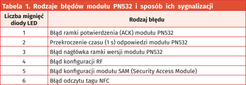 Diody sygnalizacyjne GREEN i RED służą standardowo do sygnalizowania stanu pracy urządzenia (w tym ewentualnych błędów), zaś przyciski ADD i REMOVE służą do obsługi urządzenia. Zacznijmy od początku. Tuż po włączeniu zasilania następuje włączenie diod RED i GREEN w celu kontroli ich sprawności. To jedyny moment w trakcie pracy urządzenia, gdy obie diody zapalają się jednocześnie. Po upływie ok. 1000 ms testu przeprowadzana jest konfiguracja modułu PN532. W przypadku pojawienia się jakichkolwiek błędów sytuacja taka zostanie zasygnalizowana poprzez mrugnięcia czerwonej diody LED (RED), przy czym liczba tych mrugnięć zależy od typu błędów, jakie pojawiły się podczas inicjalizacji modułu i pokazano je w tabeli 1.