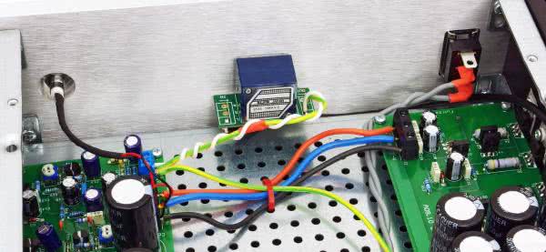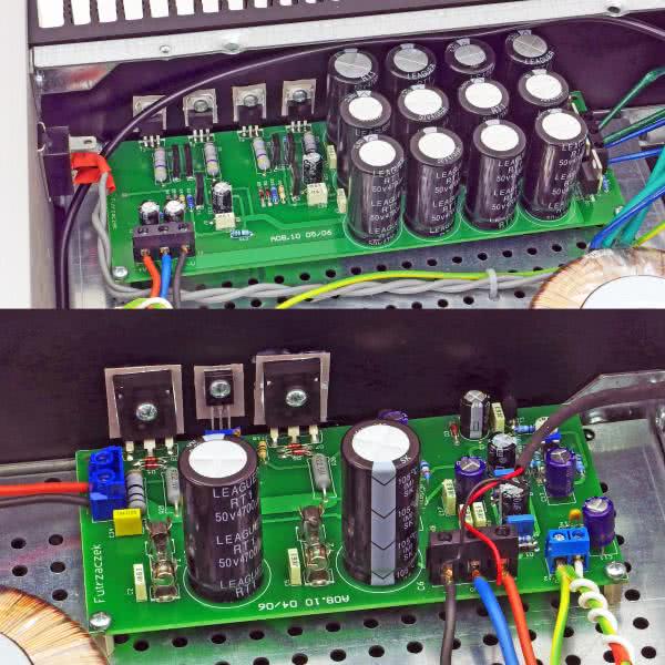 Płytki zasilacza i wzmacniacza należy przytwierdzić do płyty montażowej obudowy za pośrednictwem izolujących tulei dystansowych o długości 8 mm, najlepiej wykonanych z poliamidu. Najlepiej przykręcić je krótkimi śrubami M3 do płytek, a dopiero potem włożyć w wykonane w płycie montażowej otwory. Wtedy można przykręcić gwinty tulei dystansowych nakrętkami od spodu. Płytę montażową trzeba nawiercić samodzielnie – zwykła wiertarka i ostre wiertło do metalu pozwolą wykonać to zadanie w kilkanaście minut.