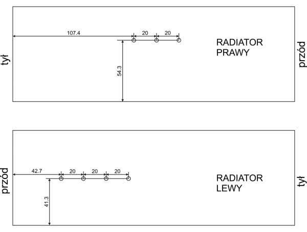 Boki obudowy są jednocześnie czernionymi radiatorami, które doskonale odprowadzają ciepło z tranzystorów. Zostało w nich wykonane łącznie siedem otworów z gwintem M3, które służą przykręceniu tych elementów półprzewodnikowych. Szczegółowe wymiary znajdują się na rysunku 9. Radiatory są na tyle duże, że chłodzenie pasywne jest całkowicie wystarczające.