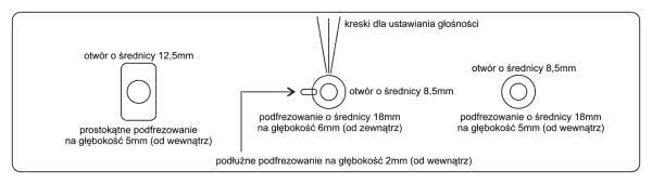 Natomiast gruba płyta przednia musiała zostać nie tylko powiercona, lecz również miejscowo pocieniona (podfrezowana), aby możliwe było przykręcenie do niej oprawki diody LED, potencjometru regulacji głośności oraz wyłącznika sieciowego. Szczegóły zostały pokazane na rysunku 8. Wszystkie trzy elementy znajdują się w połowie wysokości płyty czołowej. Kreski na panelu przednim ułatwiają precyzyjne ustawienie pokrętła regulacji głośności, a jest ich więcej niż jedna na wypadek, gdyby któraś się starła w trakcie eksploatacji. Podłużne frezowanie od strony wnętrza obudowy służy zabezpieczeniu potencjometru regulacji głośności przed przekręcaniem się.