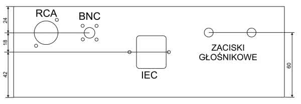 W płycie tylnej zostały wycięte otwory pod złącza sygnałowe, złącze zasilające IEC i dwa zaciski głośnikowe (rysunek 7). Użyte w prototypie gniazdo RCA zostało przykręcone dwiema śrubkami M3, z kolei gniazdo BNC ma cztery gwintowane otwory w rogach, idealnie pasujące pod śruby z gwintem M2,5.