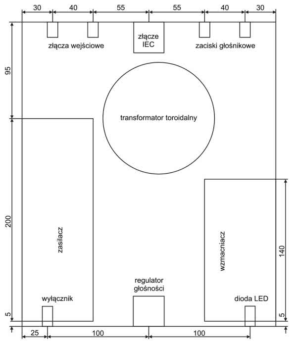Układ podzespołów wewnątrz obudowy został pokazany na rysunku 6 wraz z wymiarowaniem. Takie rozmieszczenie elementów na panelu przednim i tylnym jest ergonomiczne, a zarazem umożliwia redukcję długości najważniejszych połączeń. Transformator sieciowy jest odsunięty od czułych obwodów wejściowych wzmacniacza, co zmniejsza przenikanie przydźwięku sieciowego. Obudowa została spersonalizowana przez firmę EX-OR (usługa dodatkowo płatna) poprzez jej wycięcie, wyfrezowanie i nawiercenie w odpowiednich miejscach.