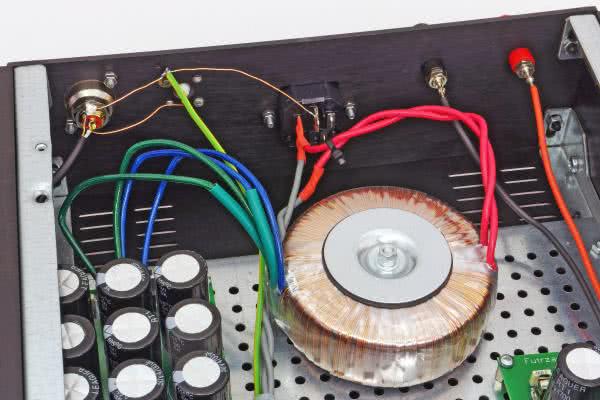Transformator sieciowy można przykręcić do płyty montażowej, używając do tego jednego z otworów jej perforacji – mają wystarczającą średnicę. Połączenia prowadzące napięcie sieciowe powinny być, w miarę możliwości, skręcone ze sobą dla zmniejszenia natężenia emitowanego przez nie pola o częstotliwości 50 Hz. Ta sama uwaga powinna dotyczyć przewodów uzwojenia wtórnego, które prowadzą do płytki zasilacza, lecz są one dosyć twarde i zachodzi obawa ich złamania. Szczegóły można zobaczyć na fotografii 5.