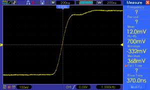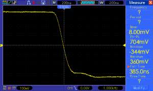 Oscylogramy są widoczne na rysunku 10 i rysunku 11. Czas narastania, zmierzony automatycznie oscyloskopem, wyniósł 370 ns, a opadania 385 ns – są więc praktycznie takie same. Co istotne, zbocza nie są opatrzone charakterystycznymi „dzwonieniami”, które zdradzają nieprawidłową pracę pętli sprzężenia zwrotnego.