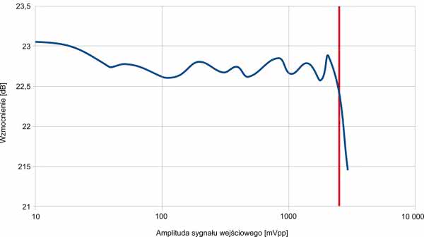 Następnie oceniono liniowość wzmacniacza, czyli stałość wzmocnienia w funkcji amplitudy sygnału wejściowego. To badanie przeprowadzono przy użyciu sygnału sinusoidalnego o częstotliwości 1 kHz. Rysunek 14 dowodzi, że w całym użytecznym zakresie amplitudy sygnału wejściowego fluktuacje wzmocnienia mieszczą się w paśmie o szerokości 0,5 dB. Czerwoną linią zaznaczono moment, w którym wzmacniacz zaczyna zniekształcać. Powyżej tego punktu wzmocnienie w naturalny sposób spada, gdyż amplituda sygnału wyjściowego już nie wzrasta, a wejściowego owszem.