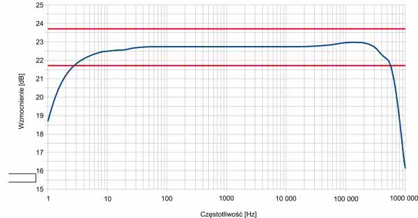 Na rysunku dodano linie pomocnicze, wyznaczające granice pasma 1 dB. Według nich ten wzmacniacz przenosi sygnał o częstotliwości od około 3 Hz do około 55 kHz, czym zadowoli nawet najlepiej wytrenowany słuch.