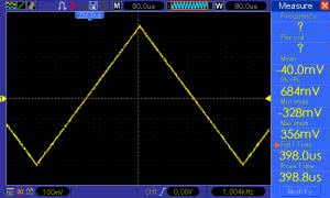 W kwestii jakości pracy wzmacniacza, a zwłaszcza zachowania fazy sygnału, dużo może powiedzieć przepuszczenie przezeń sygnału trójkątnego. Rysunek 12 to oscylogram sygnału wyjściowego przy parametrach takich samych, jak użyte były wcześniej – tyle że zmieniono kształt z prostokątnego na trójkątny. Zbocza są symetryczne i proste, a wierzchołki ostre, co świadczy o zgodności fazy wielu kolejnych harmonicznych sygnału.