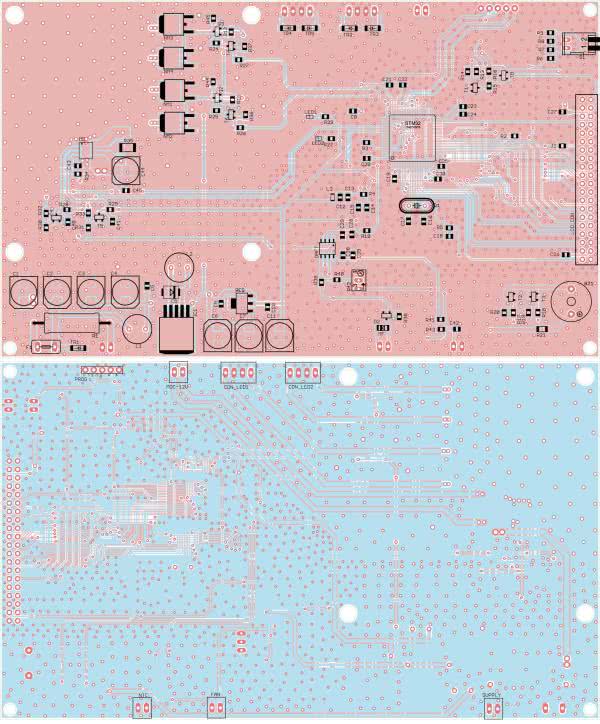 Płytka PCB, na której znajduje się przetwornica w układzie boost ma cztery otwory montażowe, służące do przymocowania jej do radiatora. Wszystkie elementy zostały umieszczone na stronie TOP aby strona BOTTOM mogła jak najlepiej przylegać za pomocą podkładki izolacyjnej do radiatora. Na płytce umieszczono dużo przelotek w pobliżu elementów na, których następują duże straty mocy w postaci ciepła. Schemat płytki został pokazany na rysunku 5.