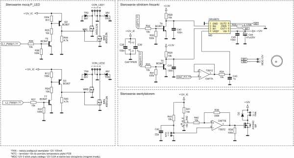 Wzmacniacz operacyjny OAFTB wraz z R40, R39, R41, R43 , R38, tranzystorem MOSFET MF, diodą D2, kondensatorem C42, potencjometrem R42 stanowi układ regulatora dwustanowego z histerezą. Układ służy do sterowania pracą wentylatora 12 V. Do złącza FAN został podłączony wentylator natomiast do złącza NTC został podłączony termistor NTC o wartości 10 kΩ.