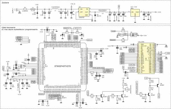 Odfiltrowane napięcie zasila przetwornicę obniżającą typu LM2575S-5V która dostarcza napięcia wyjściowego 5 V. Dławik L2, dioda Schottky’ego D1 oraz kondensatory C6, C7, C8, C9 wraz z układem IC1 tworzą typowy układ dla przetwornicy obniżającej. Za wyjściem przetwornicy znajduje się stabilizator liniowy LDO. Napięcie na wyjściu regulatora LDO wynosi 3,3 V i służy do zasilania mikrokontrolera oraz całego bloku sterowania wyświetlaczem. Ekran urządzenia został wykonany z użyciem wyświetlacza 7-calowego z wbudowanym kontrolerem SSD1963 wyposażonego w panel dotykowy z kontrolerem XPT2046. Wyświetlacz ma dwurzędowe złącze 40-stykowe o rastrze 2,54 mm.