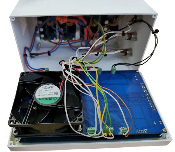 Gdy wszystko jest ze sobą podłączone należy sprawdzić po podłączeniu zasilania czy diody POWER LED UV są prawidłowo sterowane z jednostki sterującej, czy jest możliwość zmiany mocy ich świecenia oraz czy silnik prądu stałego jest prawidłowo sterowany z jednostki sterującej. Jeżeli wszystko zostanie sprawdzone i działa prawidłowo można przejść do montażu całego układu w obudowie. Ten etap został pokazany na fotografii 2 i fotografii 3.