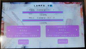 Na rysunku 13 zostało pokazane podmenu LAMPA UV. W tym podmenu zmieniając wypełnienie pasków mocy możemy zmieniać moc lamp UV. Pod paskami znajdują się czasy, które odmierza, czasomierz od momentu załączenia lampy do momentu jej wyłączenia. Czasy te można regulować ręcznie używając do tego celu strzałek lub wybrać dany czas z czasów szybkiego wyboru, które znajdują się pod czasomierzami. Aby załączyć daną lampę należy dotknąć przycisk załącz.