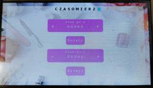 Na rysunku 14 zostało pokazane podmenu CZASOMIERZ, w którym możemy ustawić dwa niezależne czasy, od których odlicza czasomierz. W momencie gdy czasomierz odliczy czas do zera zostaje uruchomiony sygnał dźwiękowy trwający dwie sekundy. Aby załączyć dany czasomierz wystarczy dotknąć przycisk ZAŁĄCZ.