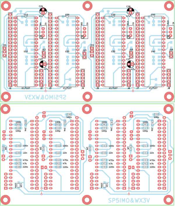 Jak już wspomniano, układ woltomierzy skonstruowano bazując na układach scalonych ICL7107. Schemat pokazano na rysunku 7, a rysunek płytki na rysunku 8. Układy każdego z woltomierzy są zgodne z notą katalogową ICL7107. Przewody łączące wtyki żeńskie gold pin z płytką woltomierzy (J11 i J14) należy zamontować od spodu płytki. Połączą one płytkę zasilaczy woltomierzy zamontowaną pod płytką woltomierzy. Należy zwracać uwagę na polaryzację napięć podczas łączenia wtyków i gniazd na płytce zasilacza woltomierzy.