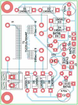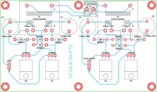 W układzie tym zastosowano transformator TSZZ3/004MP wyposażony w dwa uzwojenia 6 V/240 mA. Napięcie z każdego z uzwojeń jest prostowane za pomocą diodowego układu mostkowego (D1...D4 i D5...D8), filtrowane kondensatorami elektrolitycznymi (C1...C4), a napięcia dodatnie i ujemne są stabilizowane za pomocą układów scalonych (U1...U4). Rysunek jednostronnej płytki drukowanej pokazano na rysunku 6.