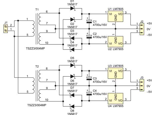 W opisywanym zasilaczu znajdują się dwa układy stabilizacji napięcia, a to powoduje, że koniecznym jest zbudowanie jednej pary zasilaczy ±5 V. Schemat owej pary pokazano na rysunku 5.