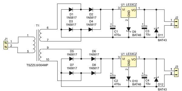 Na płytce znajduje się malutki transformator sieciowy z dwoma niezależnymi uzwojeniami wtórnymi o napięciu ok. 6 V. Każde z tych napięć jest prostowane za pomocą prostowników pełno-okresowych (diody D1...D4 i D5...D8), filtrowane za pomocą kondensatorów (C1 i C2), a następnie podane na wejście monolitycznych stabilizatorów U1 i U2 o stabilizowanym napięciu 3,3 V. Warto zauważyć, że na wyprowadzeniu 2 każdego ze stabilizatorów znajdują się (opcjonalne) diody Schottky’ego pozwalające na podwyższenie stabilizowanego napięcia o około 0,2 V. Ich wmontowanie może okazać się niezbędne wówczas gdy napięcie odniesienia głównego stabilizatora z rysunku 1 przekraczałoby 3,3 V. Diody D11 i D12 zabezpieczają układy U1 i U2 przed podaniem na ich wyjście (z głównego stabilizatora z rysunku 1) napięcia o przeciwnej polaryzacji. Taka sytuacja może zachodzić podczas jednoczesnego włączania (uruchamiania) obu układów.