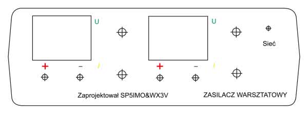 Na płytę czołową należy wydrukować i nakleić prosty rysunek z oznaczeniami, którego projekt został pokazany na rysunku 11. Takie rozwiązanie pozwoli dodatkowo zasłonić łby śrub. Papierowy wydruk należy koniecznie zabezpieczyć cienką, transparentną, ale sztywną folią. Warto zauważyć, że w płycie tylnej i czołowej konieczne jest wykonanie prostokątnych otworów dla radiatora i wyświetlaczy siedmiosegmentowych.