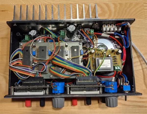 Baczną uwagę należy zwrócić na lutowanie przewodów biegnących od płytki J1 i J2, J5 i J6 oraz J3 i J4, J7 i J8 do złącz żeńskich gold pin tak aby nie pomylić segmentów wyświetlaczy w złączu na płytce, na której są one zamontowane. Przyjęte rozwiązanie z „przewodem łączącym płytki”, chociaż bardziej pracochłonne, to pozwala istotnie zmniejszyć powierzchnię płytek drukowanych. Długość przewodów należy dobrać tak aby możliwe było wysunięcie płyty czołowej zasilacza z obudowy. Ułatwi to montaż całego urządzenia. Przewody doprowadzające do wyświetlaczy woltomierza należy wlutować w płytkę od góry, a amperomierza od spodu. Nieeleganckie pęki przewodów i tak nie będą widoczne po zamknięciu obudowy całego zasilacza.