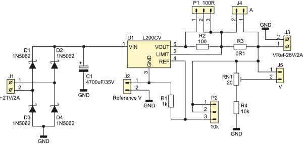 Schemat układu pokazano na rysunku 1. W jego skład wchodzi diodowy prostownik mostkowy (D1...D4), filtr tętnień (C1), scalony stabilizator napięcia (U1), układ regulacji napięcia (potencjometr P2 i rezystor R1), układ regulacji ograniczenia prądowego (potencjometr P1 i opcjonalnie rezystor R2 oraz bocznik do pomiaru natężenia prądu czerpanego z zasilacza (R3 i J4) i układ dzielnika do pomiaru napięcia (R4 i RN1). Złącze J2 służy do przyłączenia ujemnego napięcia umożliwiającego regulację napięcia wyjściowego zasilacza od zera do około 24...25 V.