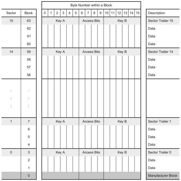 Na rysunku 1 pokazano logiczną budowę pamięci EEPROM karty Mifare. Zgodnie z wcześniejszymi ustaleniami, każdy sektor danych zawiera blok o nazwie Sector Trailer, który przechowuje klucze autoryzacyjne (dwa – A i B) umożliwiające dostęp do poszczególnych bloków sektora, jak i reguły zarządzające tym dostępem – oddzielne dla każdego z bloków, w tym bloku Sector Trailer.