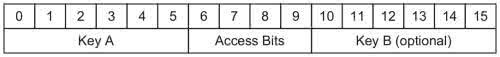 - kolejne cztery bajty (6...9) przechowują informacje o ustawionych bitach dostępu do wszystkich czterech bloków pamięci w sektorze z osobna, przy czym bajt czwarty nie jest używany. Co ważne, każdy blok w sektorze może mieć inne reguły dostępu;