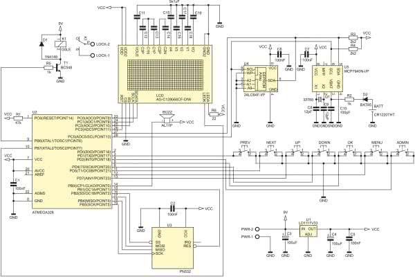 Schemat ideowy urządzenia SAS2 pokazano na rysunku 3. Zbudowano dość prosty system mikroprocesorowy, którego „sercem” jest nowoczesny mikrokontroler ATmega328 taktowany wewnętrznym, wysokostabilnym generatorem RC o częstotliwości 8 MHz, który przy udziale sprzętowego interfejsu TWI (odpowiednik I2C) zapewnia obsługę pamięci EEPROM (U4) oraz obsługę układu MCP7940N-I/P (U5) realizującego funkcjonalność dokładnego zegara czasu rzeczywistego (RTC) wyposażonego w zintegrowany, automatyczny mechanizm podtrzymania zasilania (co zapewnia bateria CR1220).