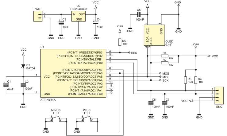 Schemat ideowy układu został pokazany na rysunku 1. Zbudowano bardzo prosty, wręcz banalny, system mikroprocesorowy, który jest sterowany niewielkim mikrokontrolerem firmy Microchip (dawniej Atmel) o oznaczeniu ATtiny84A.
