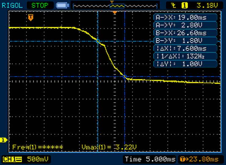Jak pokazały testy praktyczne, zastosowanie wspomnianego wcześniej rozwiązania sprzętowego (dioda D1 i kondensator C1) i mechanizmów programowych zapewnia 100% skuteczność zapisu danych z bardzo dużym marginesem czasowym. Na rysunku 2 pokazano wykres zależności napięcia zasilania mikrokontrolera w funkcji czasu podczas wyłączania urządzenia. Jak widać, dla prototypowego kondensatora C1 o wartości 22 μF (docelowo zmienionego na 47 μF) osiągnięto dostępny czas zapisu na poziomie 7,6 ms, co prawie dwukrotnie przekracza niezbędny czas na zapis pamięci EEPROM mikrokontrolera (4 ms). To tyle, jeśli chodzi o szczegóły natury programistycznej, przejdźmy zatem do schematu montażowego.